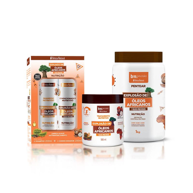 O Creme de Pentear Explosão de Óleos Africanos 1Kg traz todo o poder da nutrição e foi desenvolvido especialmente para você, que ama cabelos bem definidos e super brilhosos. Sua fórmula exclusiva traz a combinação inédita dos 7 Óleos Nutritivos Poderosos: Baobá, Kalahari, Moringa, Nigella, Tamanú, Opuntia e Karité. Rico em Vitamina E, proporciona maior proteção aos fios, e Ômega 6, poderoso agente antioxidade com ação anti frizz.